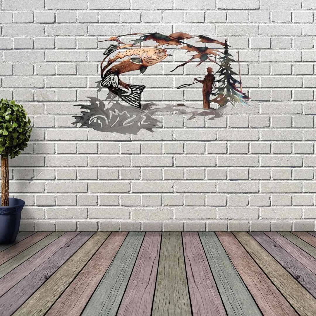 Mallard Hunting & Trout Fishing Scene Metal Wall Art Animal Shape Wall Decal Vivid Decoration